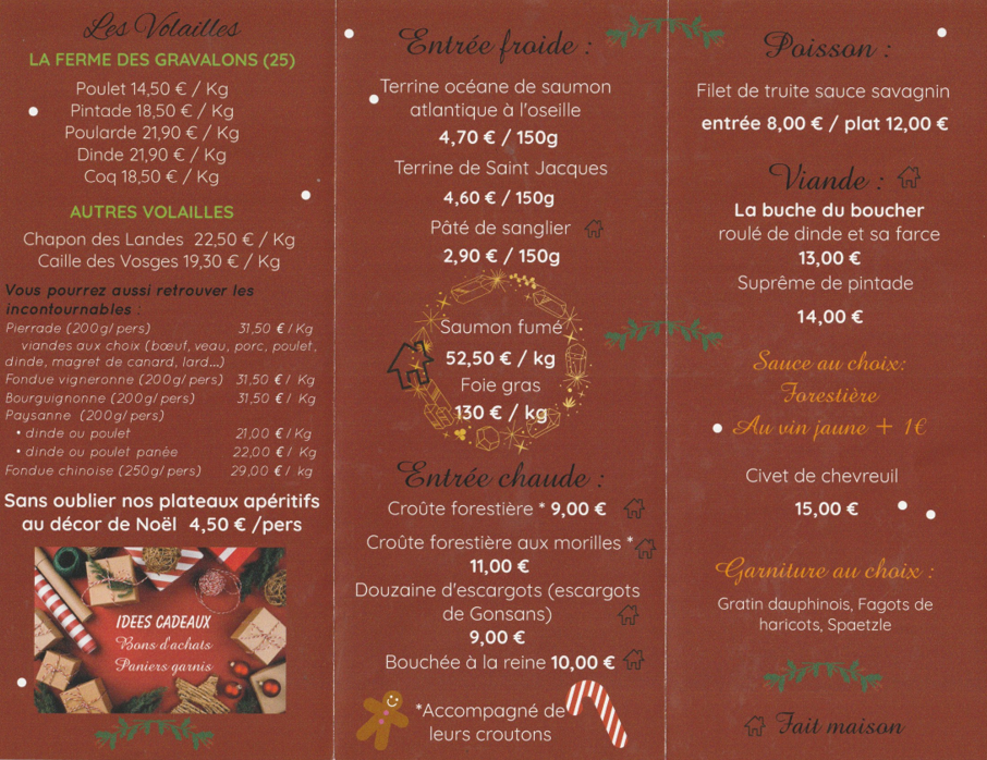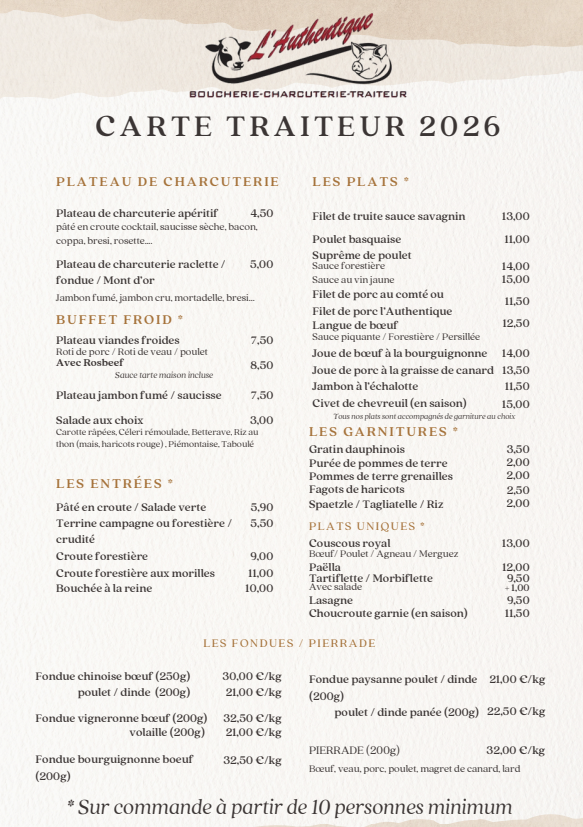 À la recherche d'un service traiteur pour rendre votre événement inoubliable ? La boucherie-charcuterie l’Authentique, située à Les Fontenelles, à proximité de Bonnétage, Maîche et Le Russey (25, Doubs), vous offre bien plus que des produits de boucherie et de charcuterie. Nous mettons également à votre disposition notre expertise afin de vous accompagner au mieux dans l’organisation de tous vos événements. Que ce soit pour un déjeuner familial ou amical, un mariage, un anniversaire ou pour les fêtes de fin d’année, notre équipe de passionnés peut vous concocter de nombreux plats froids ou chauds (pâtisseries salées, plateaux de charcuterie, plateaux apéritifs, plats cuisinés,...), réalisés avec des ingrédients frais et de qualité. Par ailleurs, que vous soyez un particulier ou un professionnel, nous tenons à vous préciser que nous ne proposons pas de service à l'assiette ni de location de vaisselles. Cependant, nous serions ravis de pouvoir vous livrer pour tous vos événements à partir d'une commande pour 30 personnes et plus. Laissez-nous prendre en charge la préparation de vos menus et profitez pleinement de chacun de vos évènements !